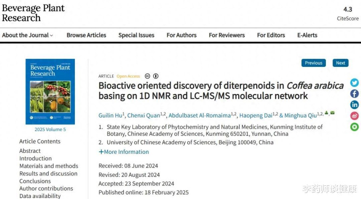 Hu G, Quan C, Al-Romaima A, Dai H, Qiu M. 2025. Bioactive oriented discovery of diterpenoids in Coffea arabica basing on 1D NMR and LC-MS/MS molecular network. Beverage Plant Research 5: e004.